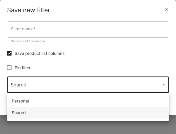 Users can share their personal filters with others by setting the Shared option in either the save dialog or the header section. Shared filters can then be loaded on the product list page or used as datasets in widgets by other users.